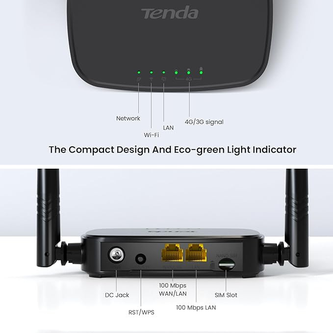 برای مودم سیمکارتی 4G تندا Tenda 4G03 pro دو عدد پورت شبکه LAN/WAN و LAN گیگابیتی در نظر گرفته شده است. همچنین یک اسلات سیمکارت میکرو بر روی این مودم قرار گرفته است تا به راحتی امکان دسترسی به شبکه موبایل برای شما فراهم شود. این مودم از پاور با 2 ولتاژ 5 و 9 ولت پشتیبانی میکند.